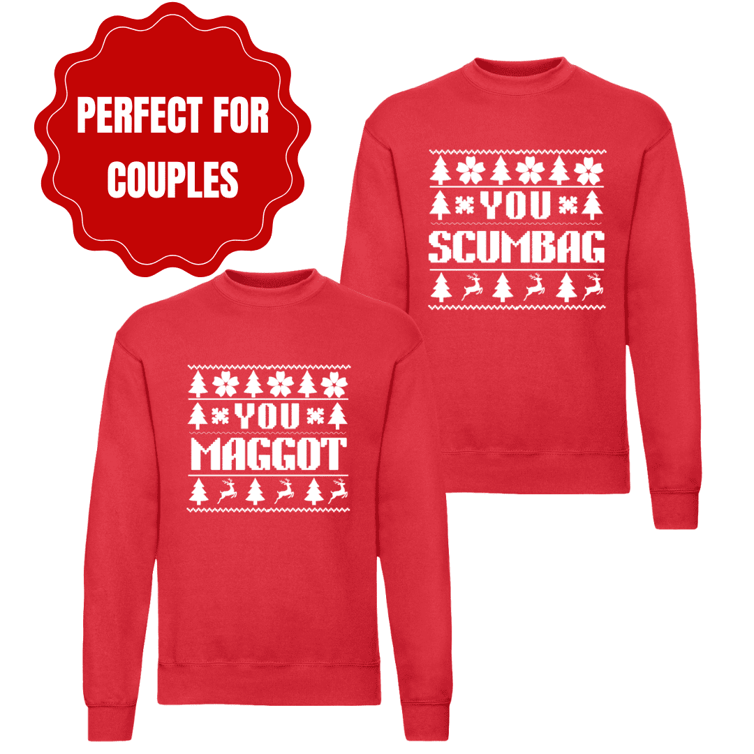 Celebrate the season with this bold You Scumbag & You Maggot Christmas sweater, inspired by the classic holiday song. Fun, cheeky, and perfect for festive parties or matching outfits with friends.